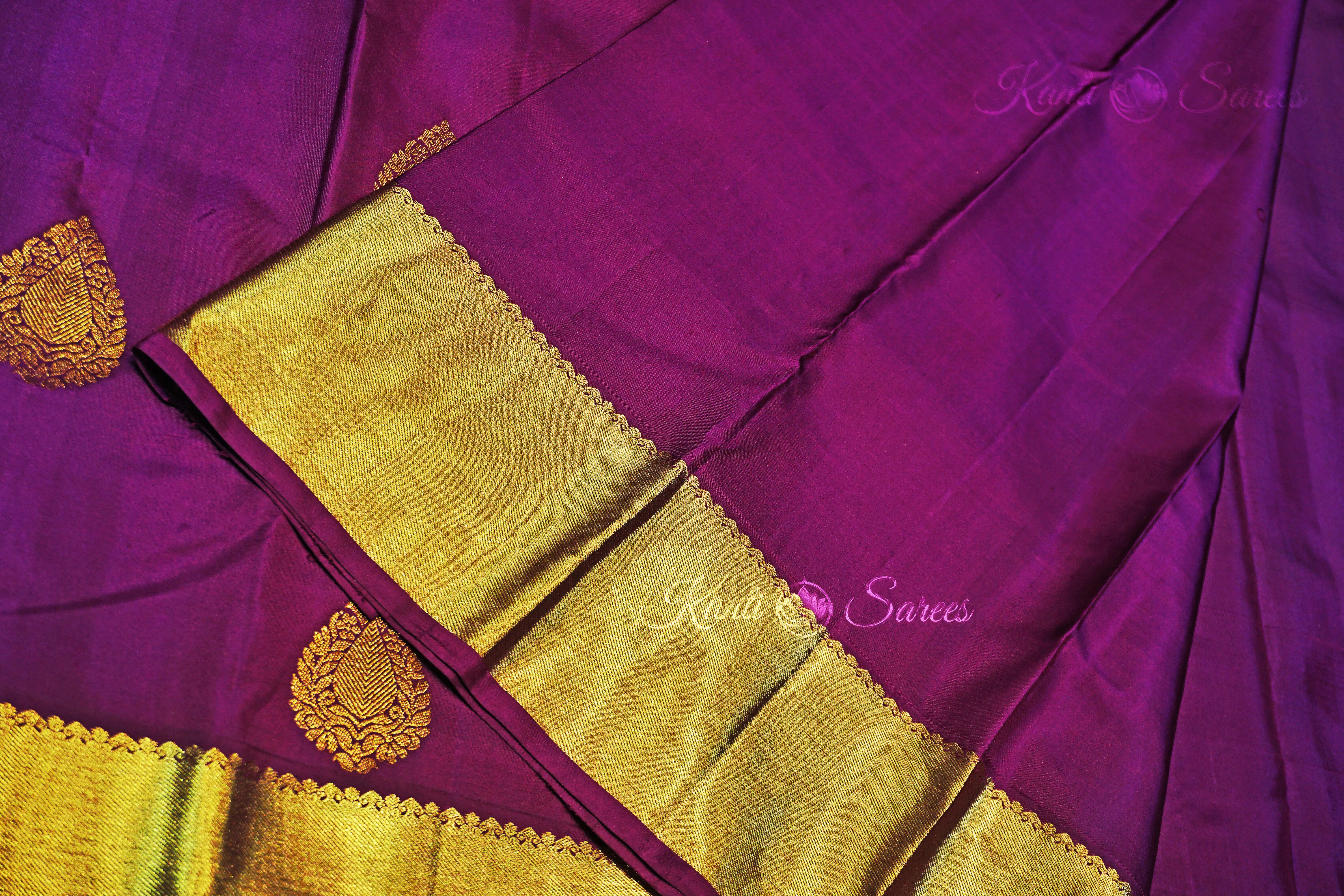 What truly distinguishes an original Kanjivaram silk saree from imitations is the quality of its zari. This Dark Purple Kanjivaram is woven using original pure gold zari, made by wrapping real gold over silver wire.