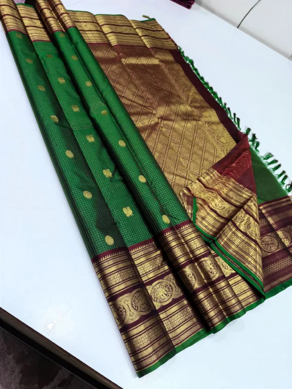 Pure kanjivaram silk saree In Bottle green and Marron red combination in vaira oosi design