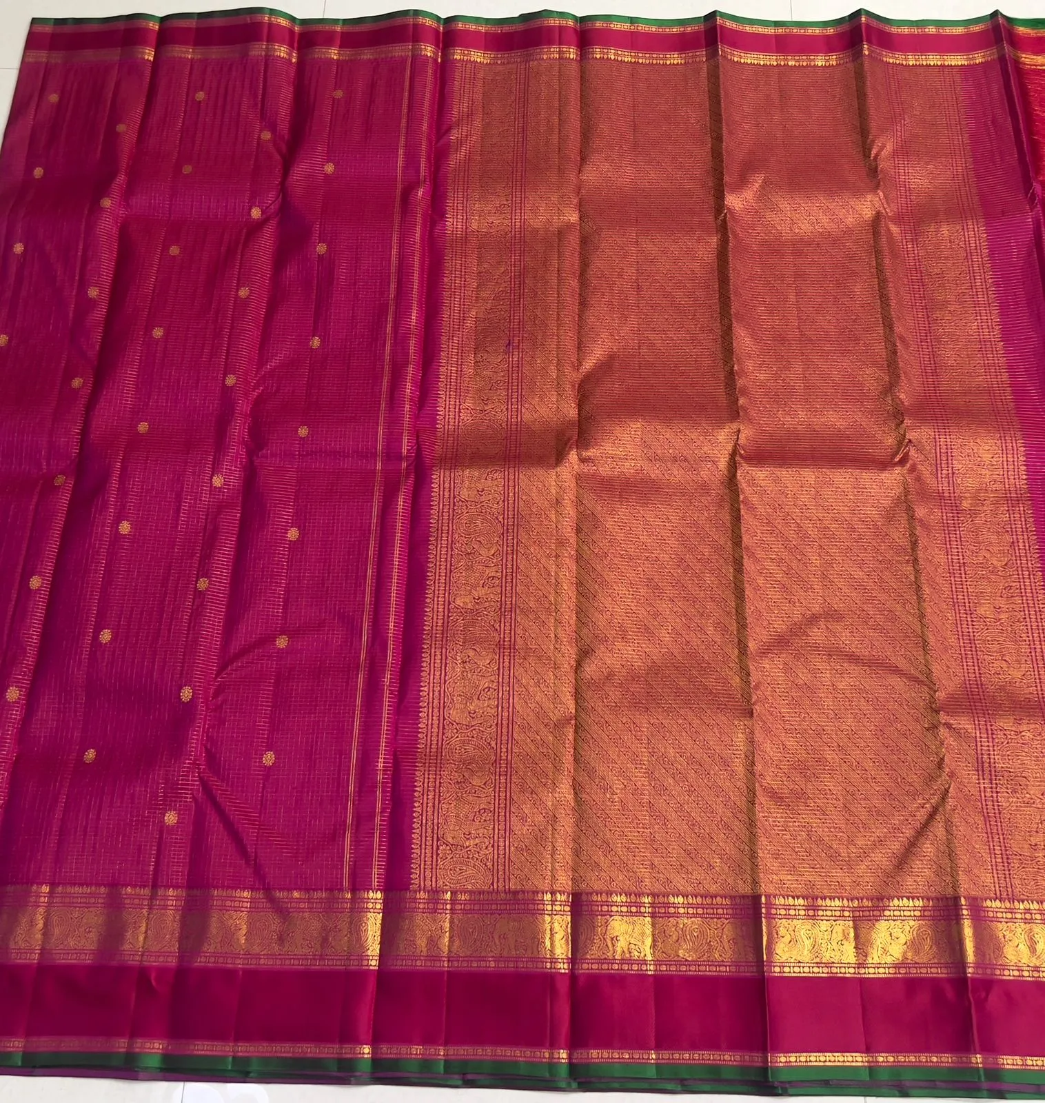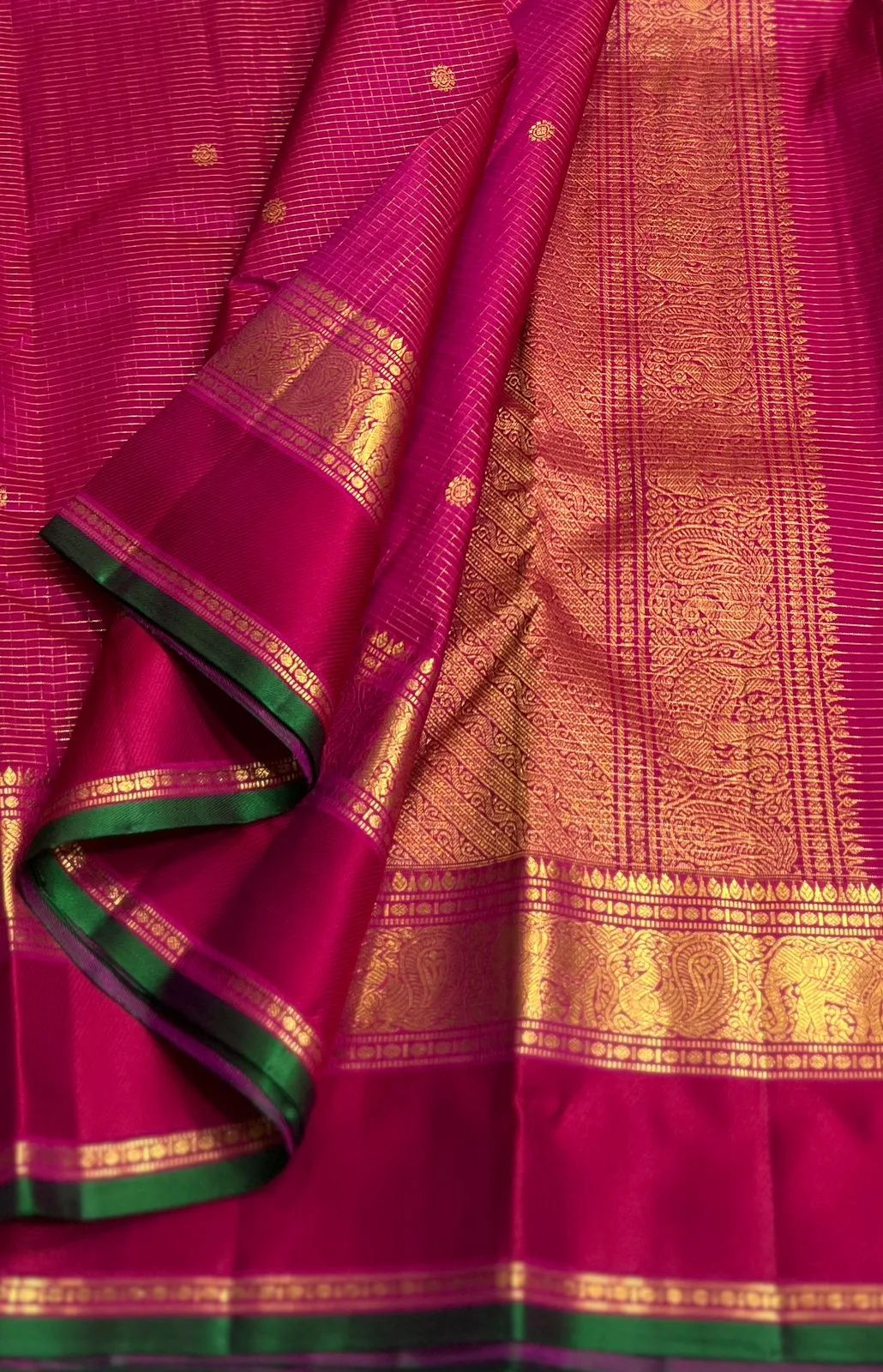 Retta Patta Border Kanchipuram Silk Saree In Rani Pink And Green Selvedge