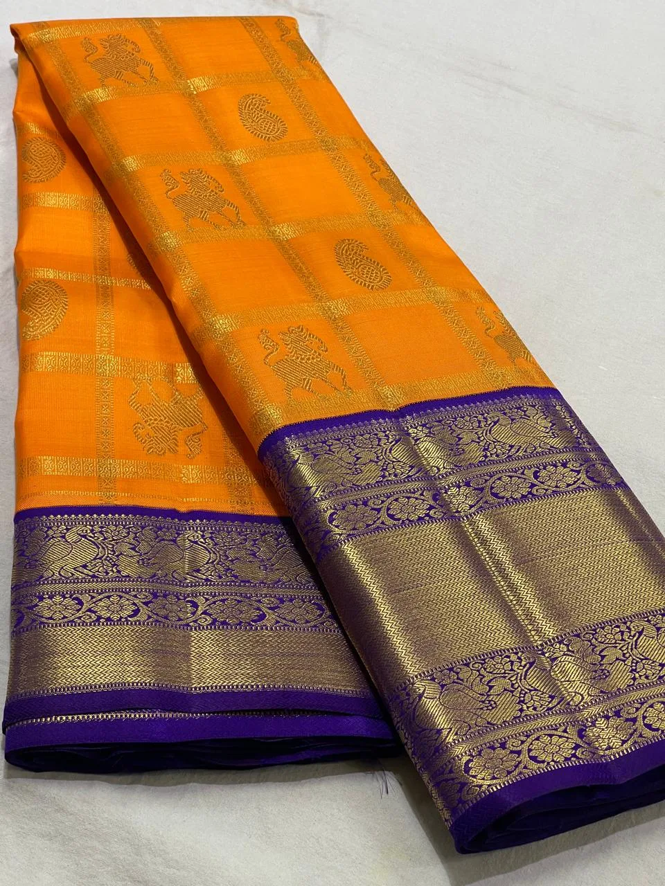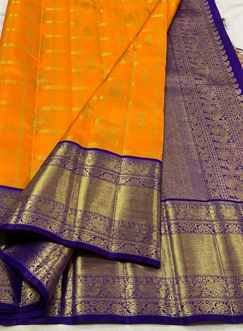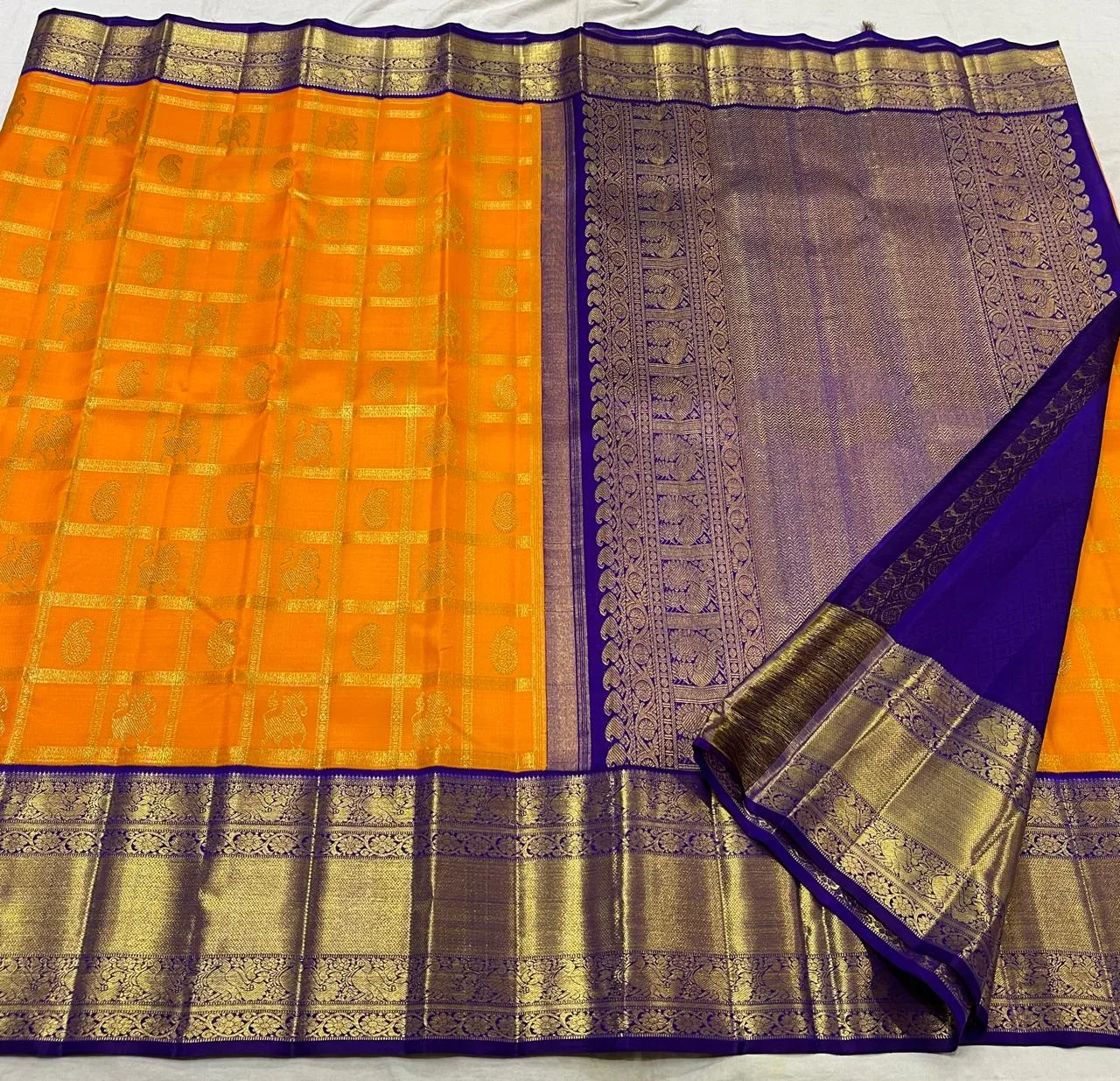 Korvai Kanchipuram Silk Saree In Orange With Royal Blue