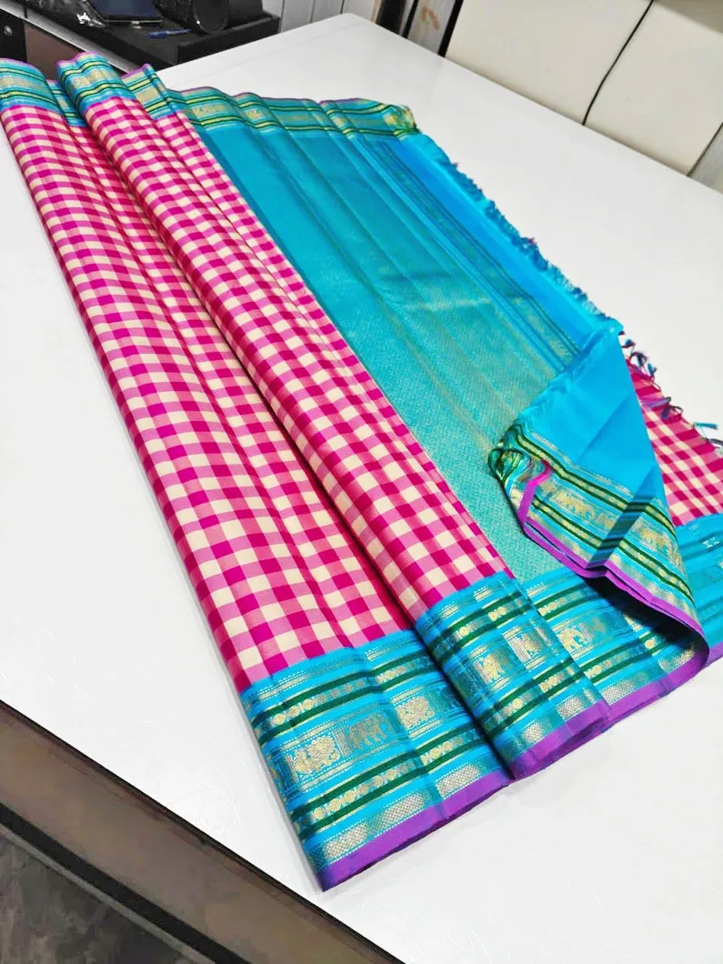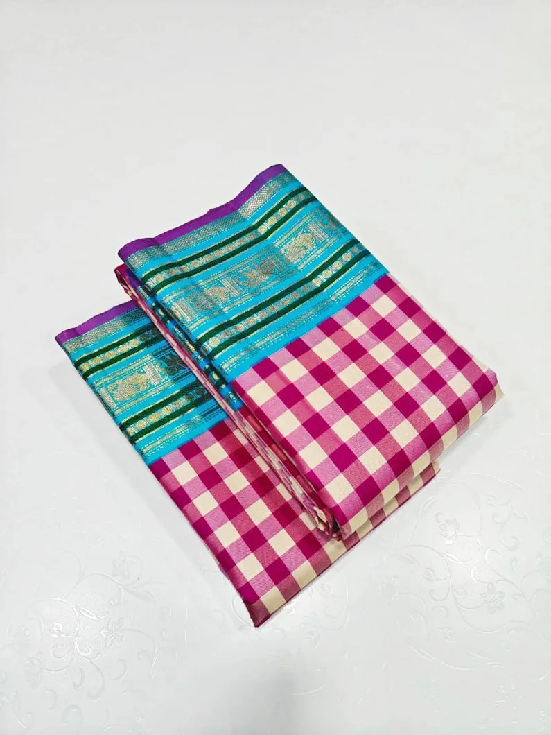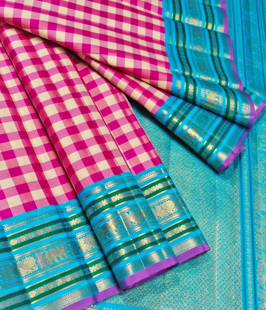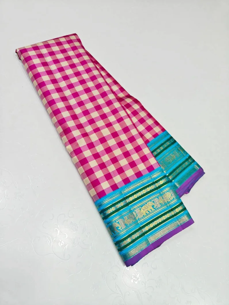 Pink Checks Kanjivaram Silk Saree with Turquoise Border