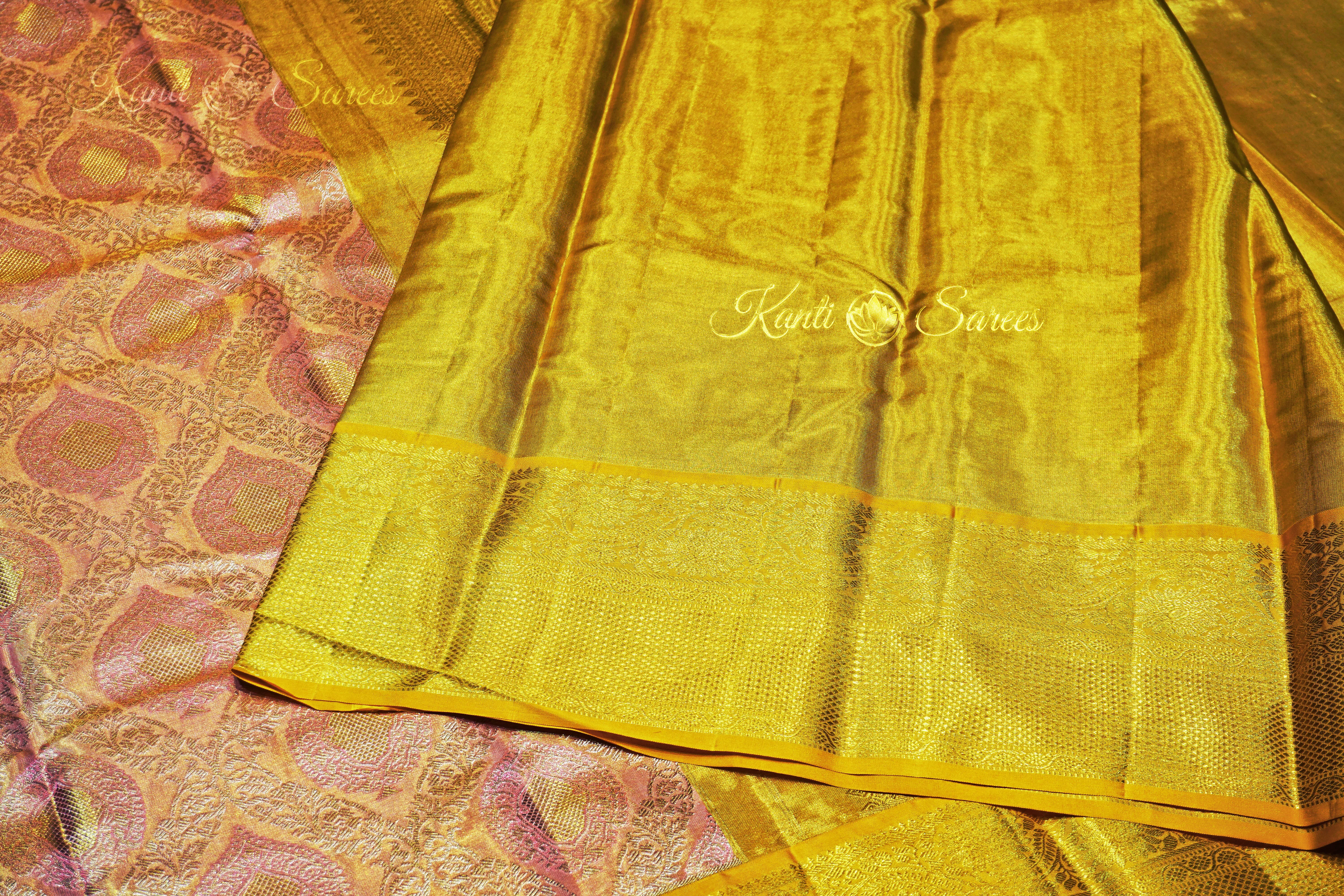 Tissue Kanjivaram Silk Saree in Baby Pink with Mango Yellow Border – A Radiant Celebration of Authentic Kanjivaram Craftsmanship
