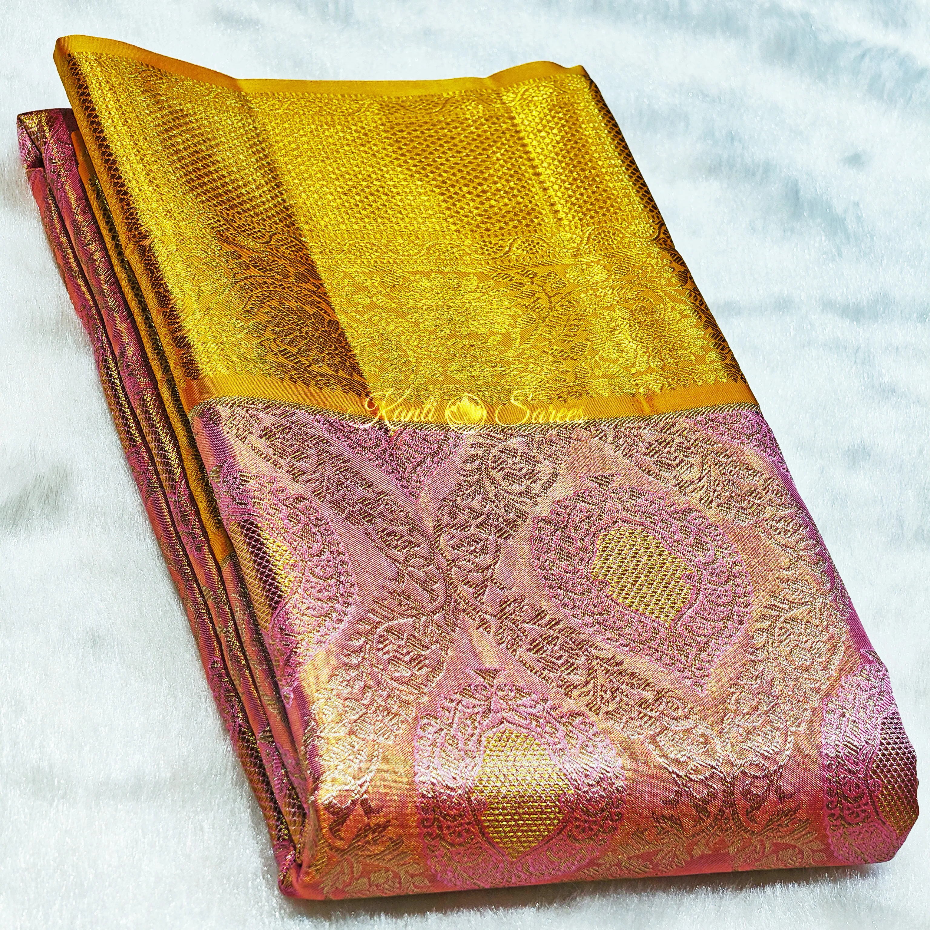 The timeless beauty of a Kanjivaram silk saree lies in its ability to blend heritage, luxury, and artistry into a single graceful drape. Among the many treasured varieties of Kanjivaram silk, Tissue Kanjivaram sarees hold a special place for their luminous texture, lightweight feel, and regal sheen. Introducing our exquisite Tissue Kanjivaram Silk Saree, woven in a soft Baby Pink body, adorned with a vibrant Mango Yellow border, and finished with a breathtaking Rich Silver Zari Brocade pallu, exclusively available at kantisarees.com.