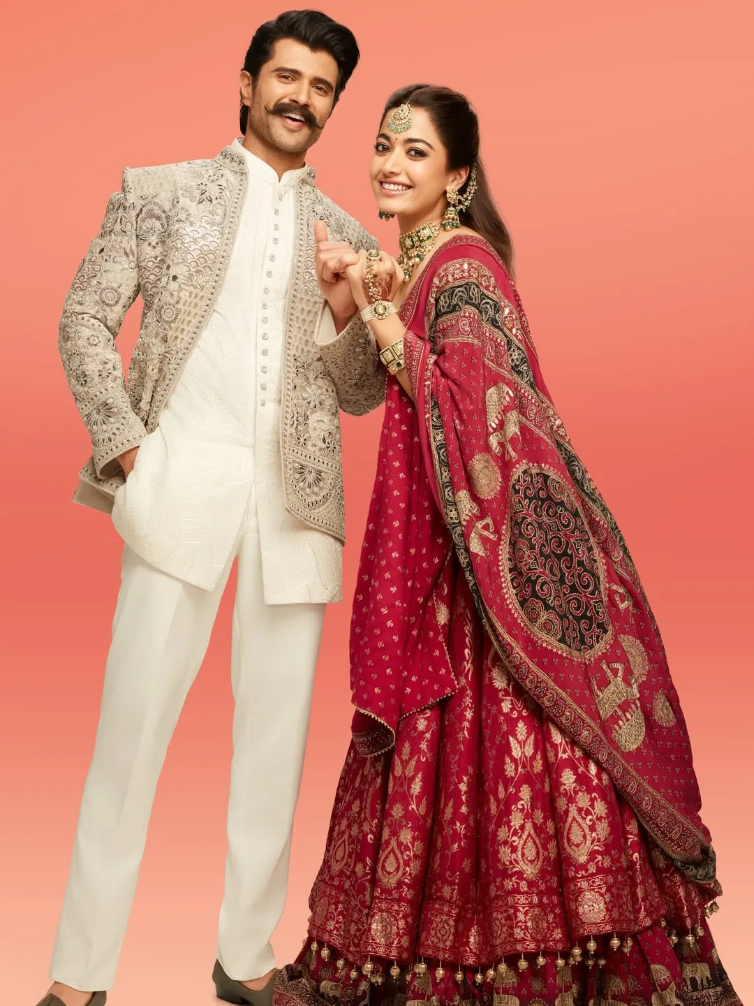 Rashmika in red lehenga. Vijay in ivory sherwani.